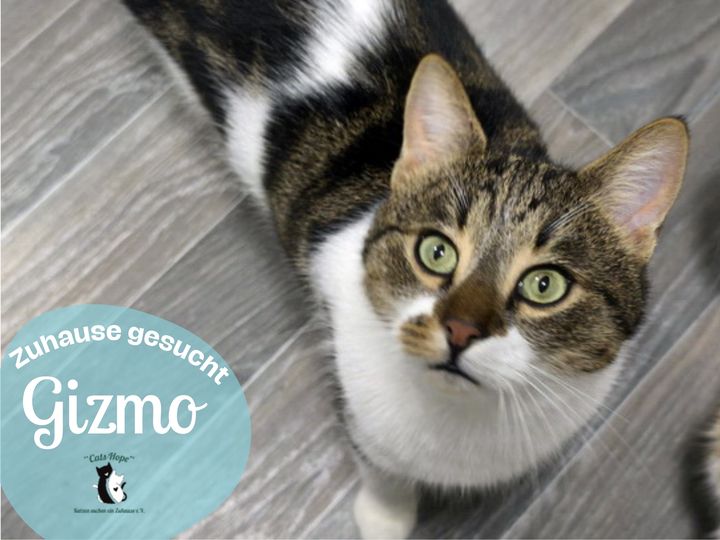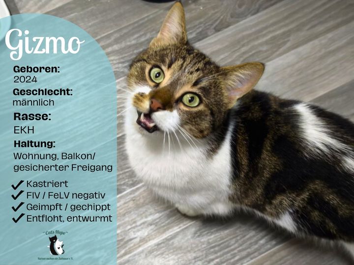 Gizmo ist ein etwa 1-jähriger Kater, ein echter Wirbelwind und hat – wie man so schön sagt – nur Flausen im Kopf. Alles, was neu ist, muss inspiziert werden, am besten sofort und gründlich. Stillstand? Langweilig!